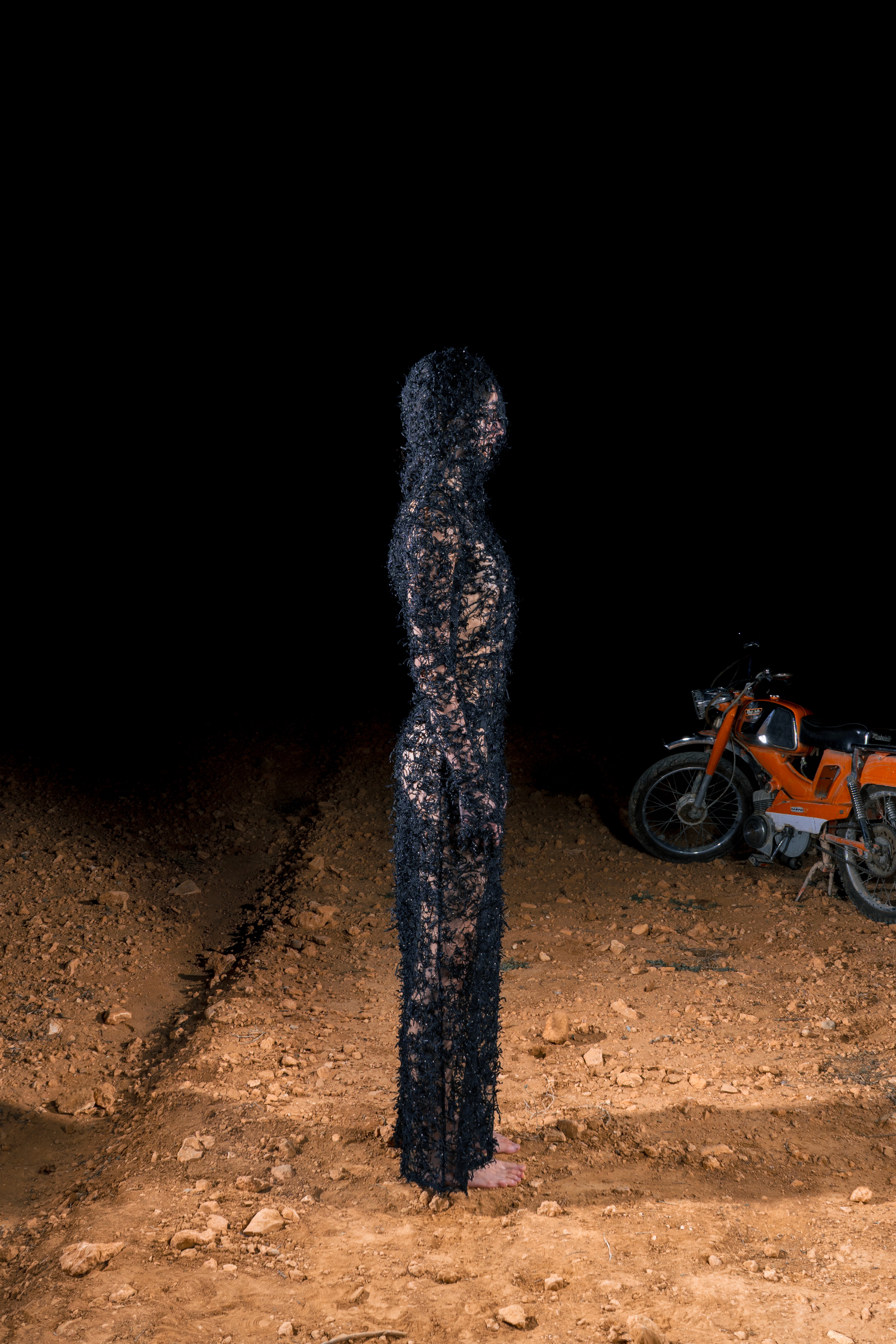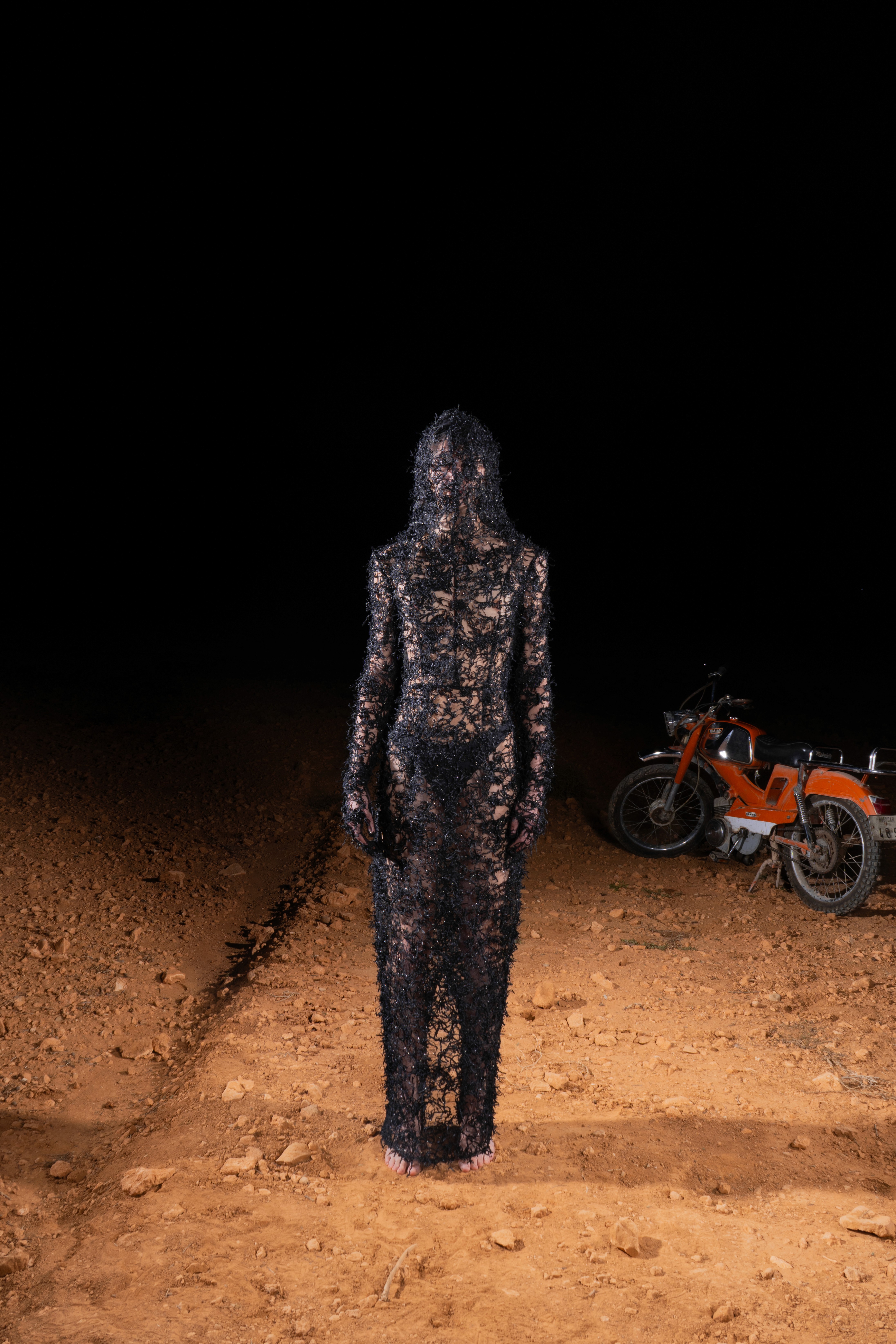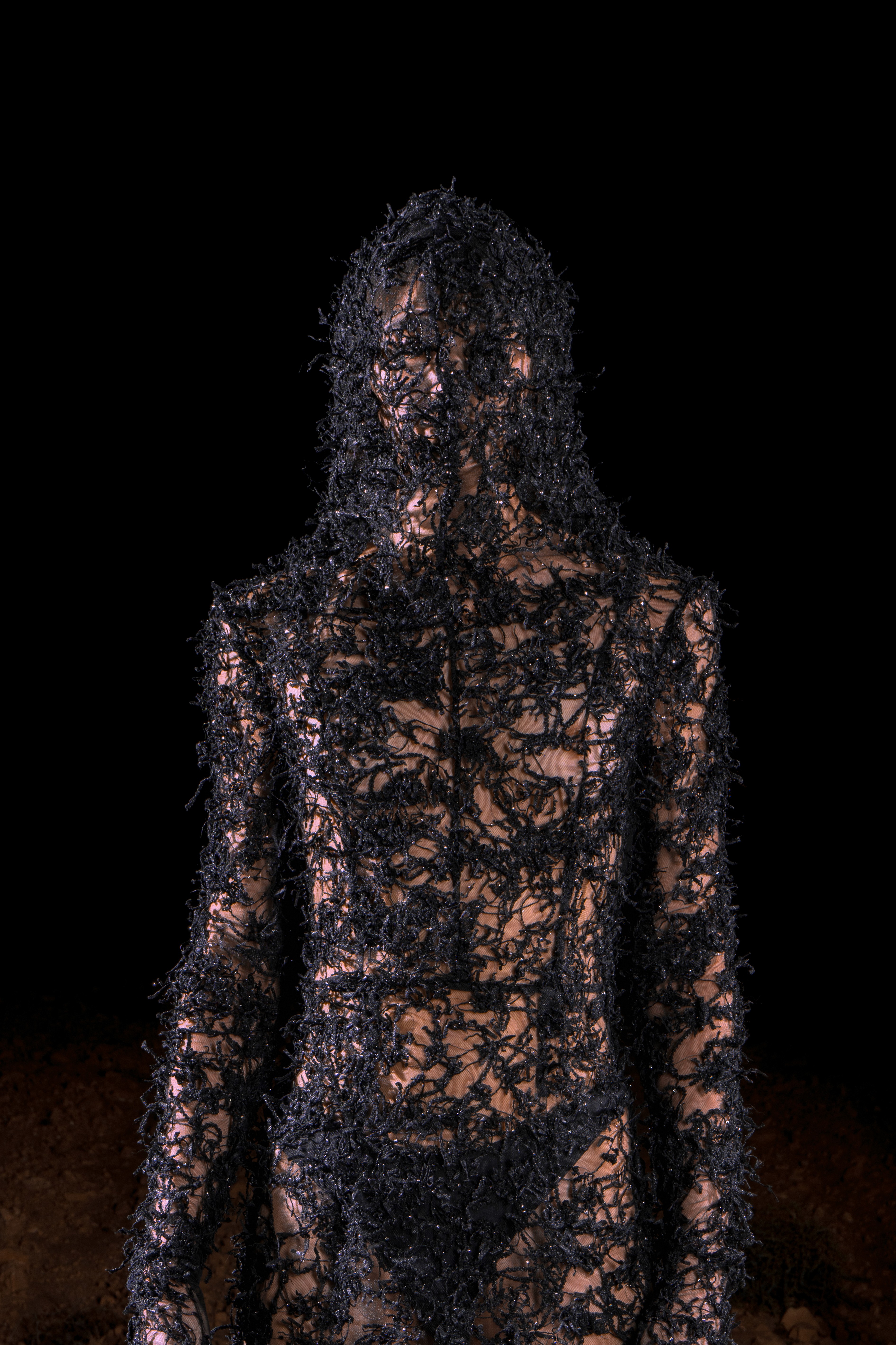 Vestido de tul bordado bouclé negro con abalorios transparentes, que cubre todo el cuerpo.