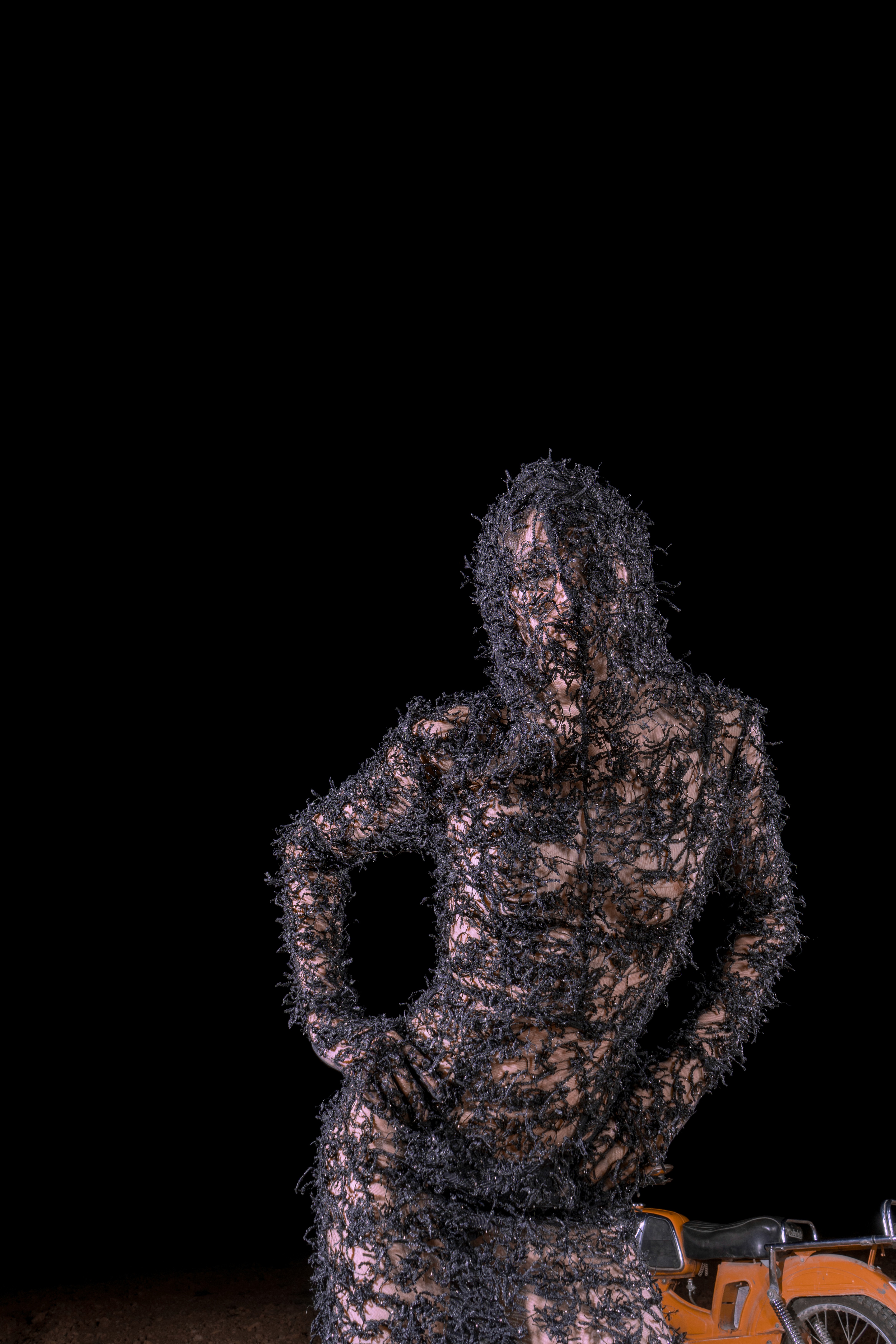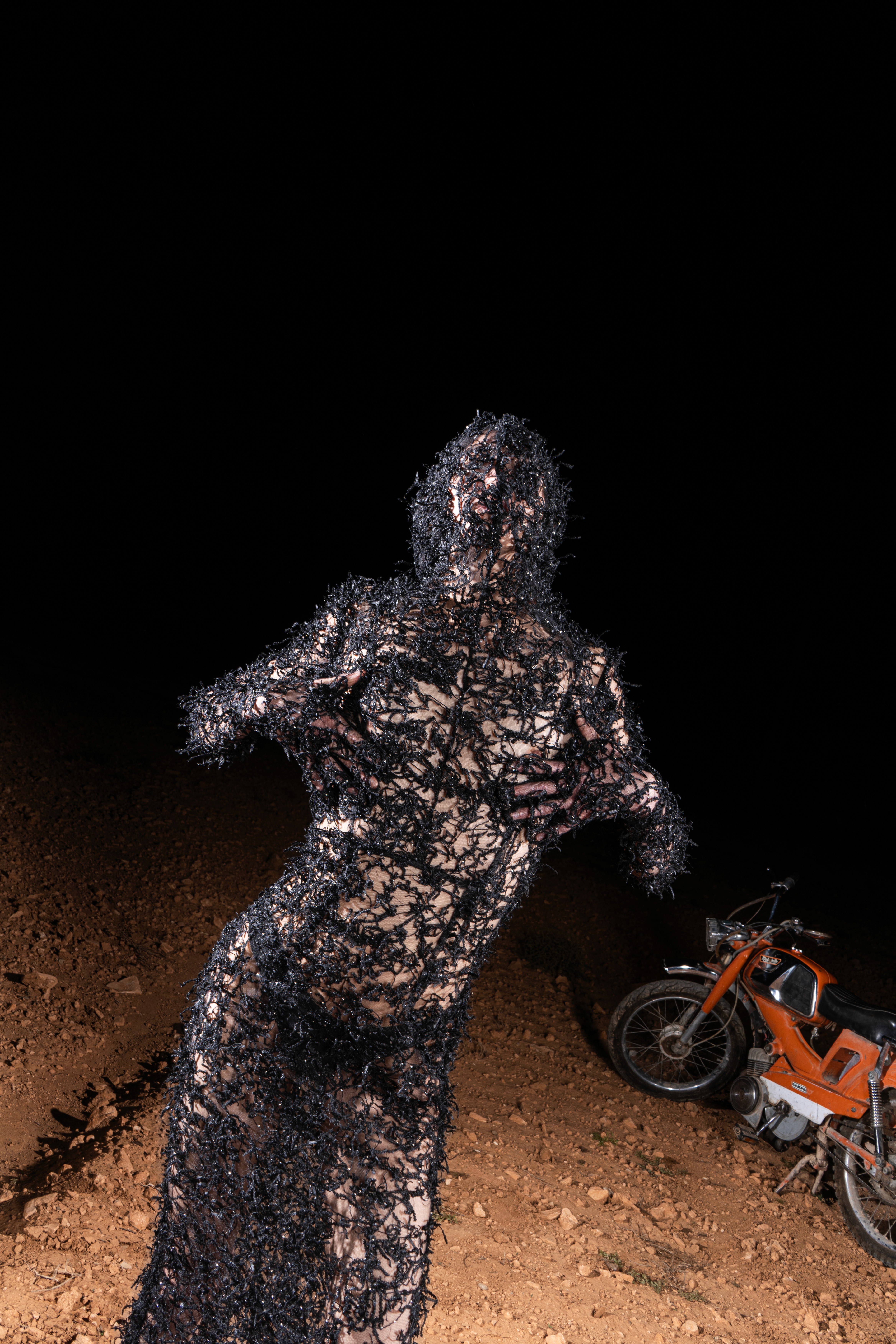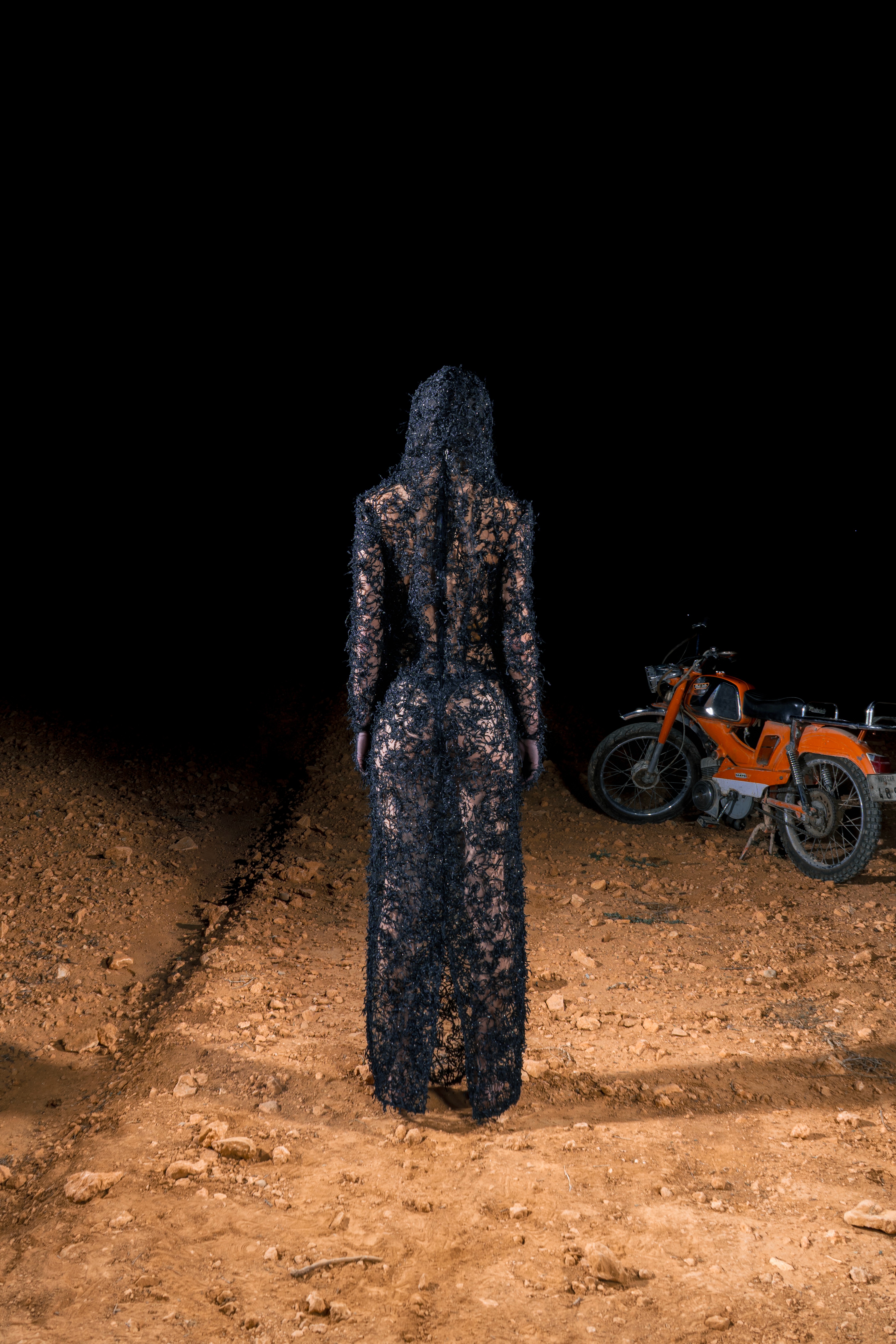 Vestido de tul bordado bouclé negro con abalorios transparentes, que cubre todo el cuerpo.