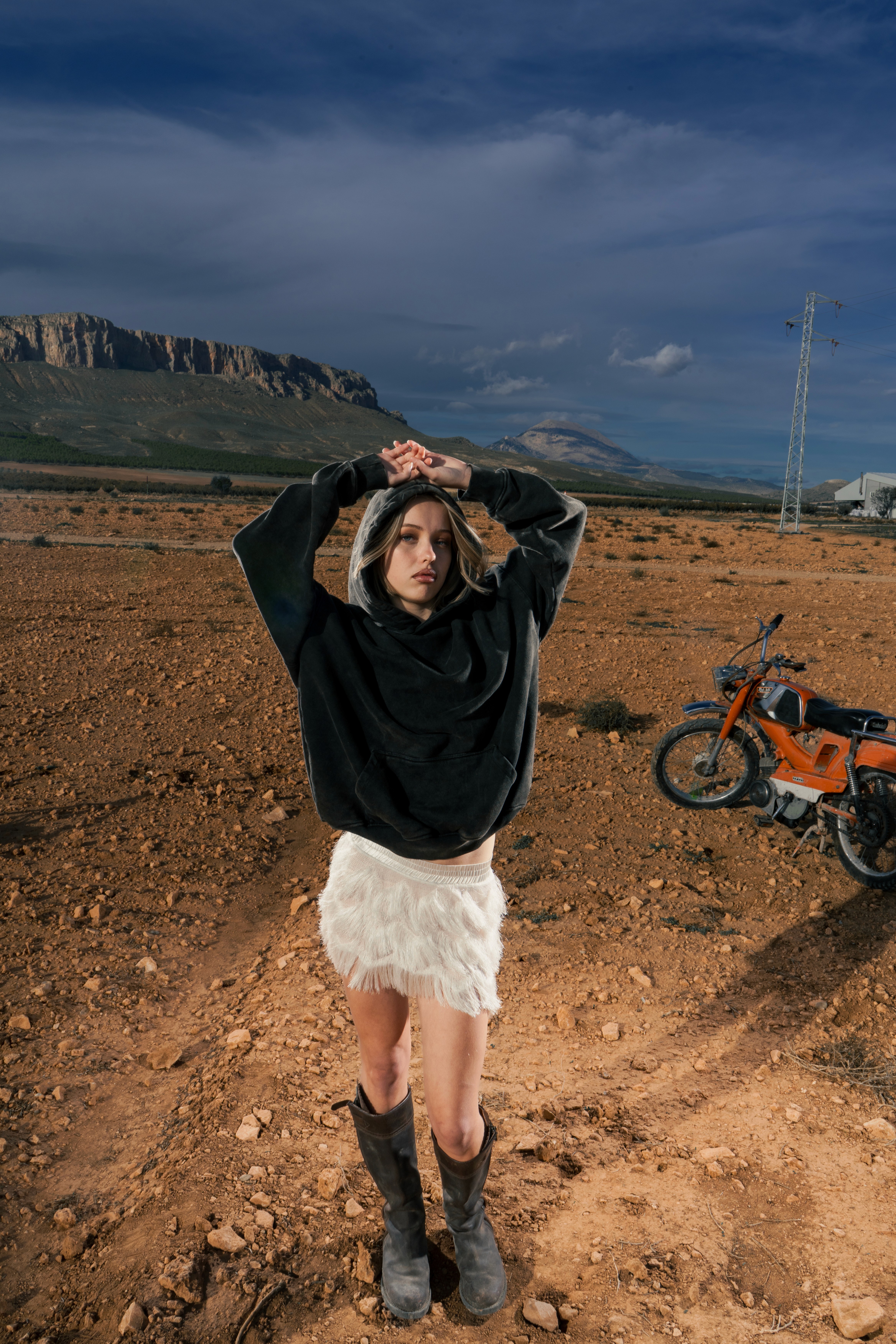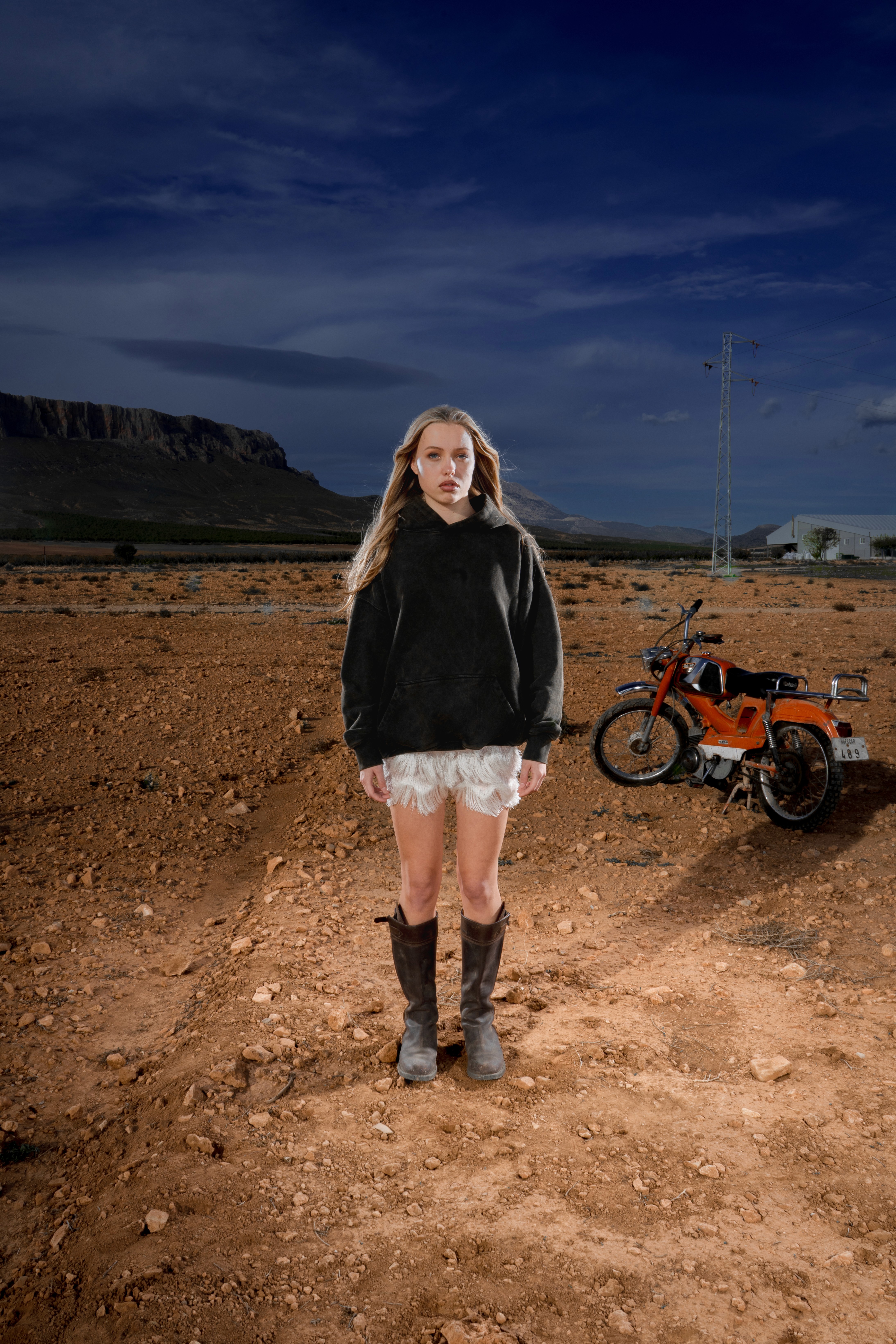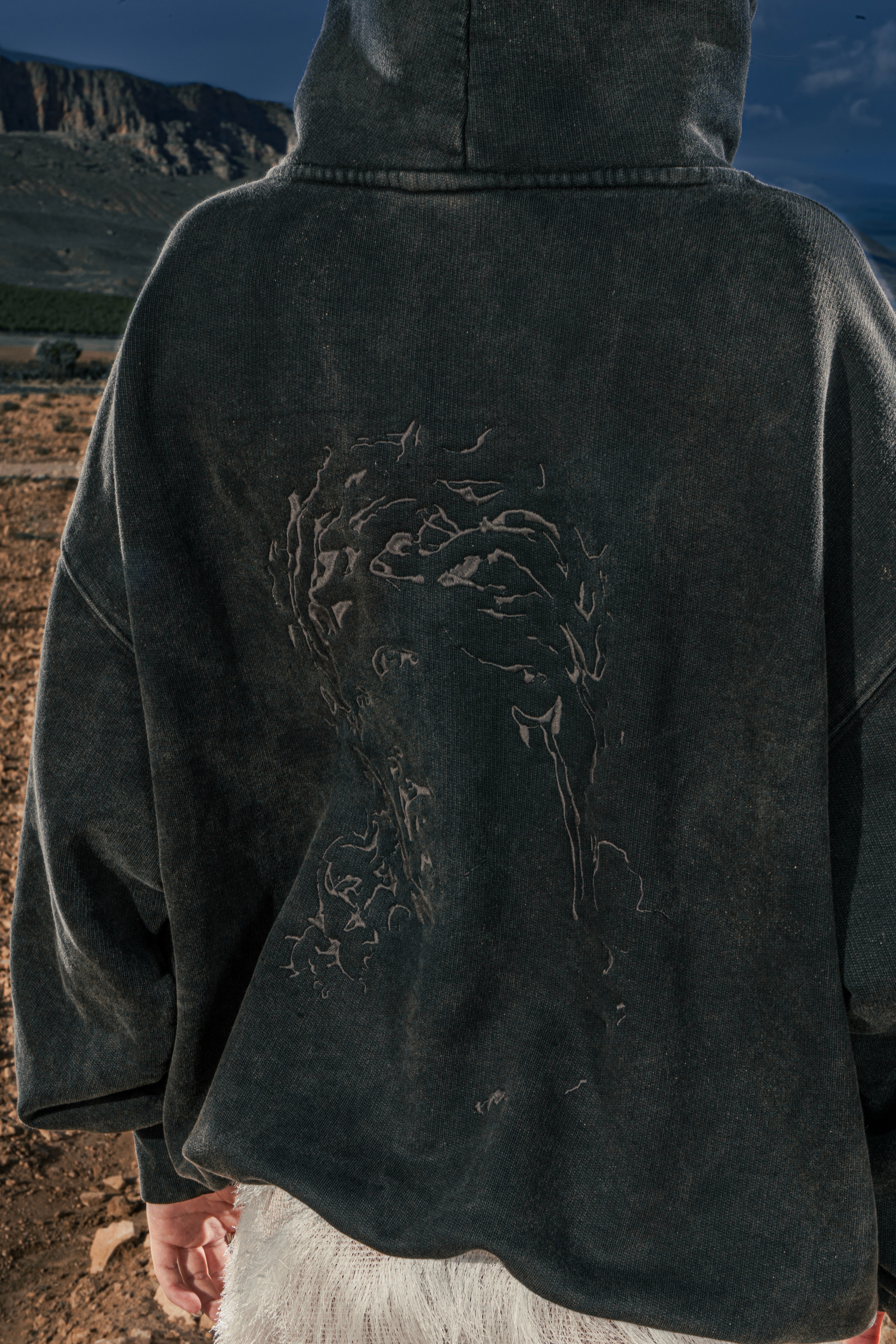 Sudadera El Cristo en algodón orgánico, con bordado de las sombras de Cristo en la espalda. Minifalda de punto con flecos satinados, acompañada de botas de montar en piel de vacuno, a tono con la pieza superior.