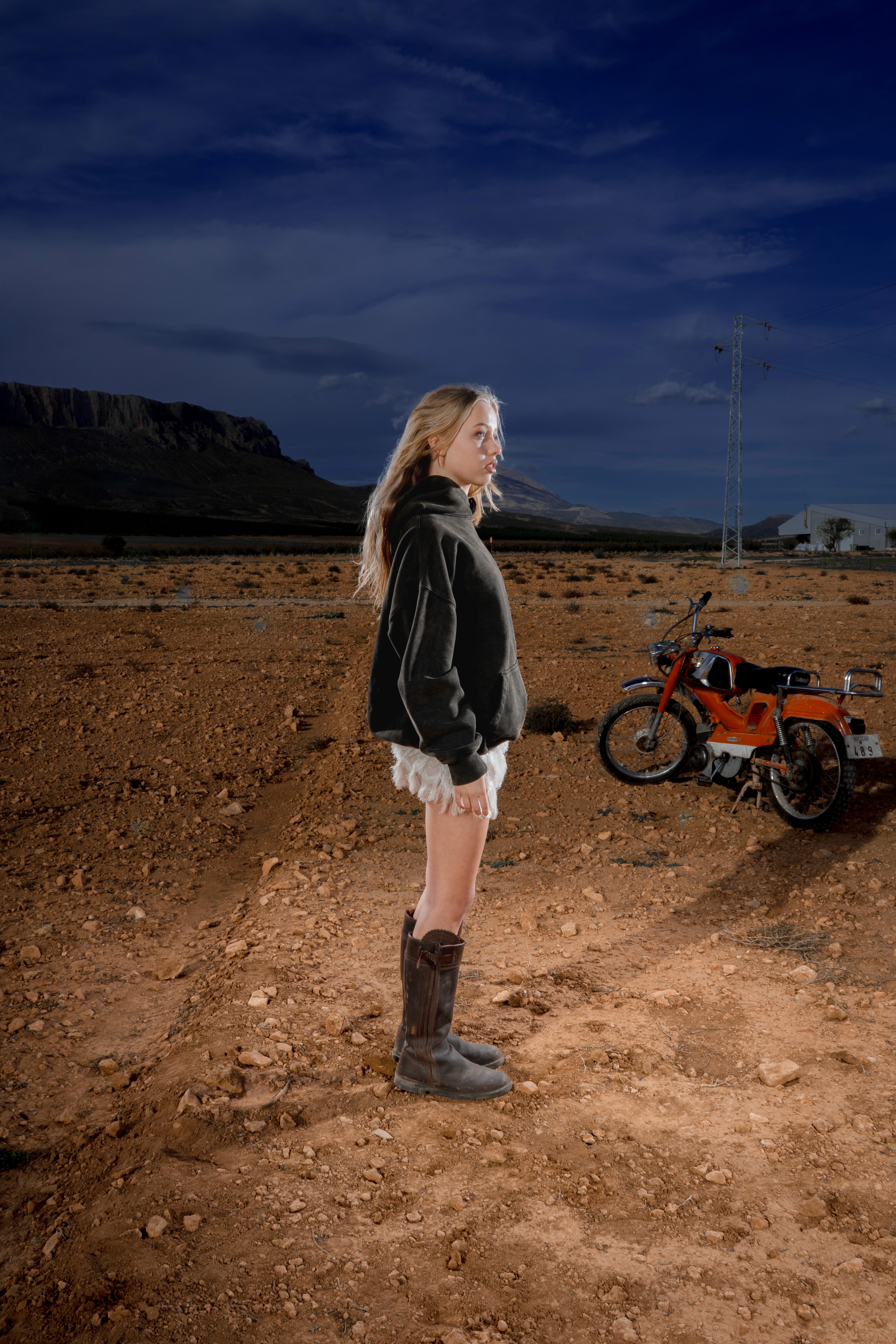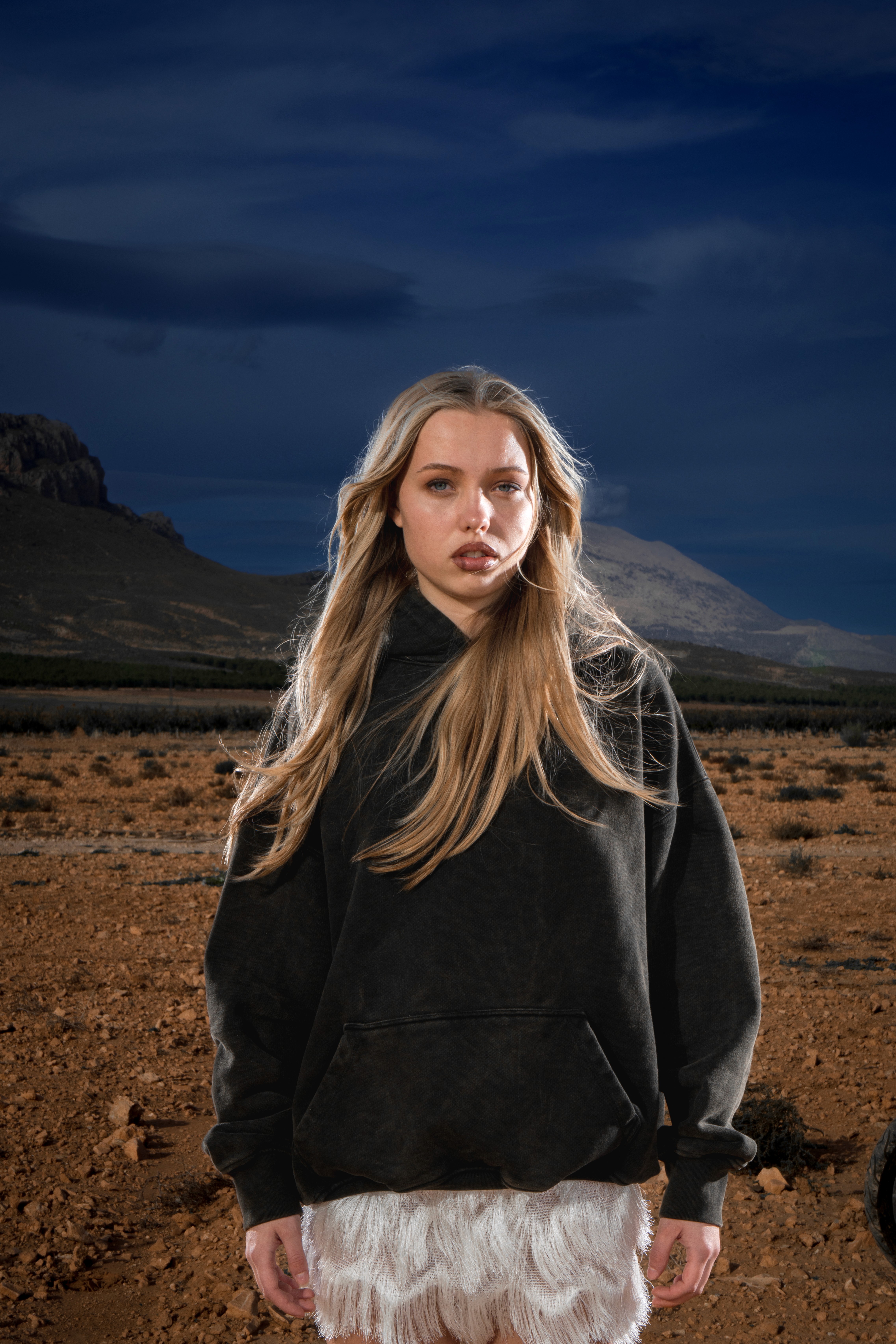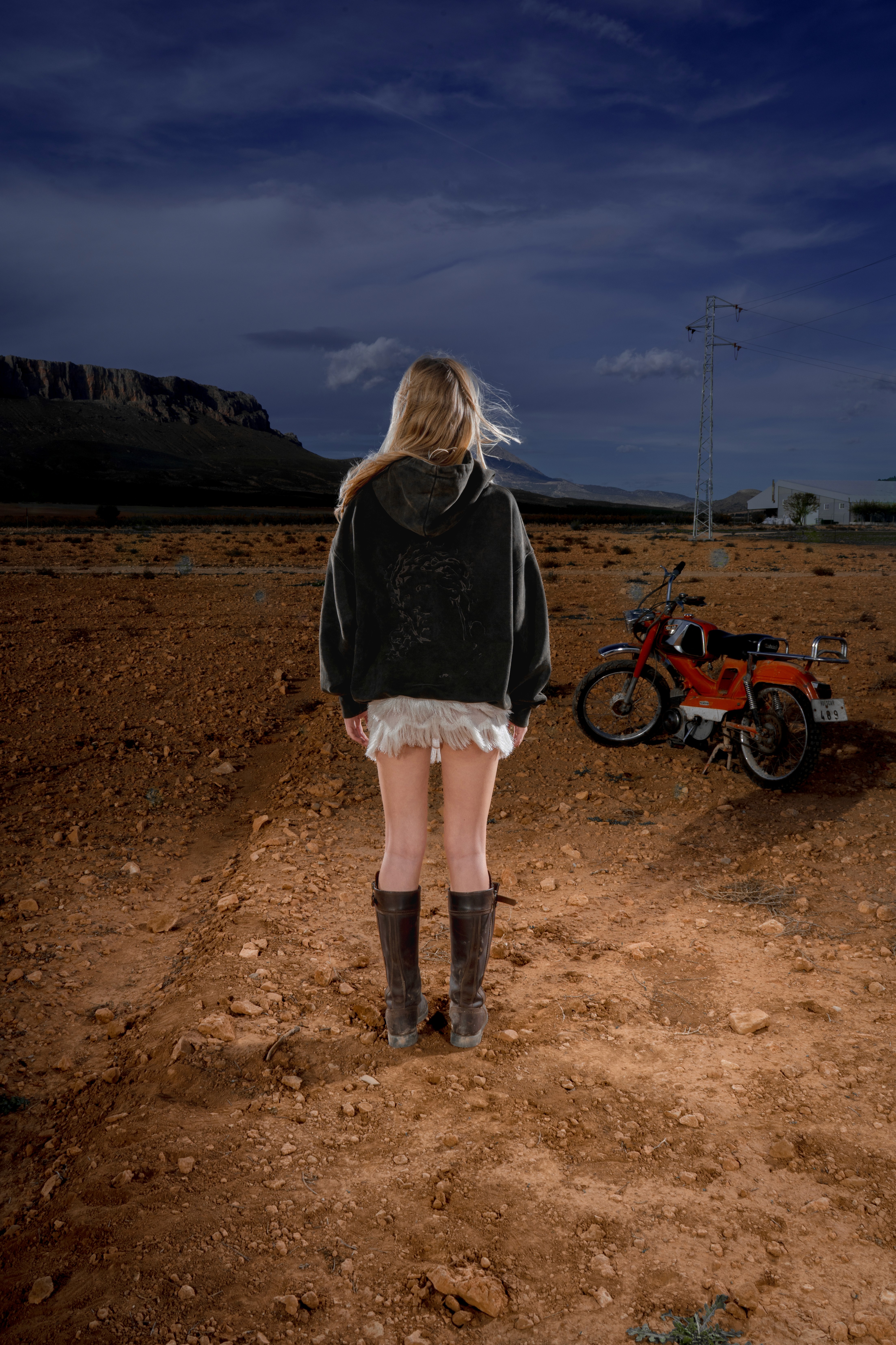 Sudadera El Cristo en algodón orgánico, con bordado de las sombras de Cristo en la espalda. Minifalda de punto con flecos satinados, acompañada de botas de montar en piel de vacuno, a tono con la pieza superior.