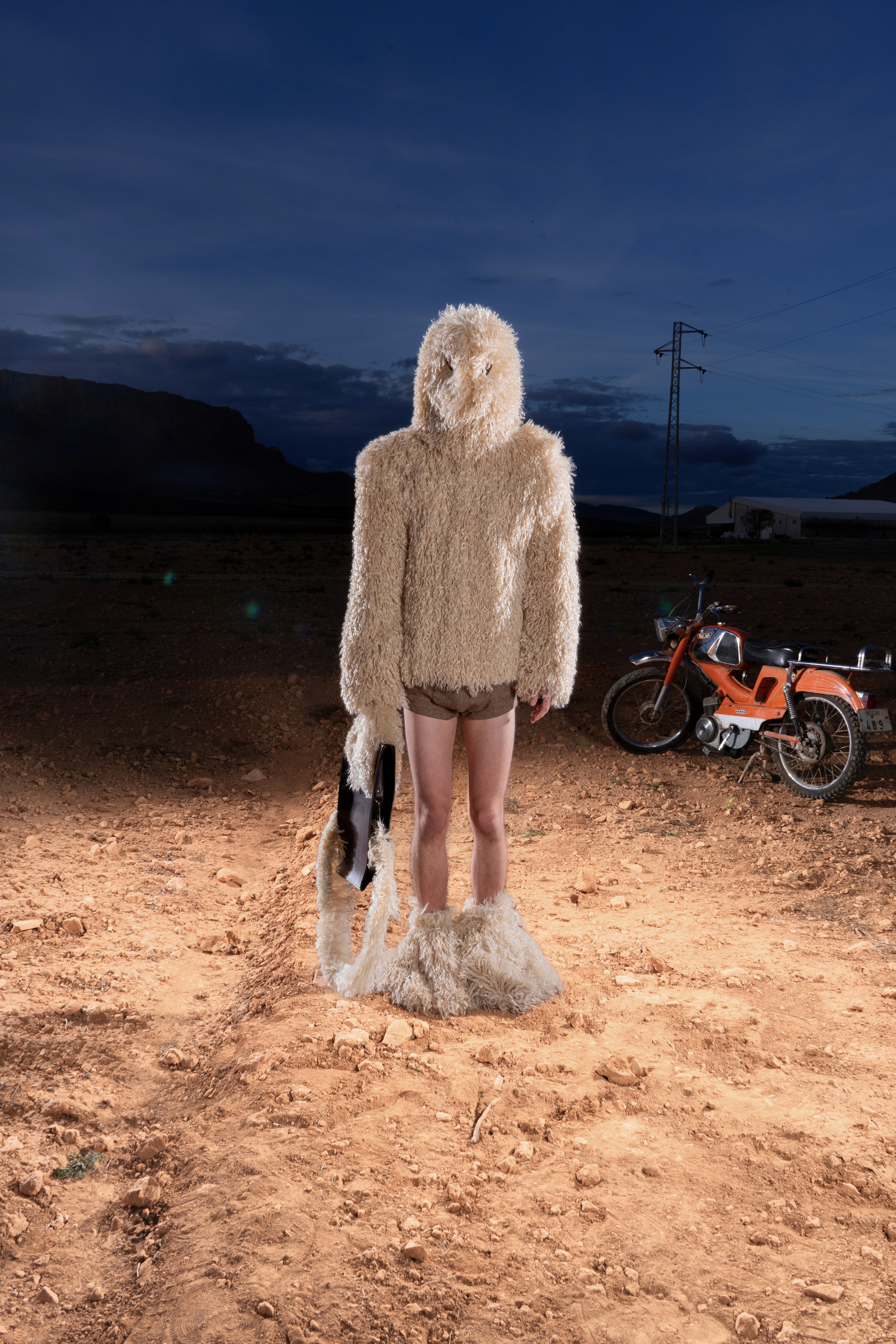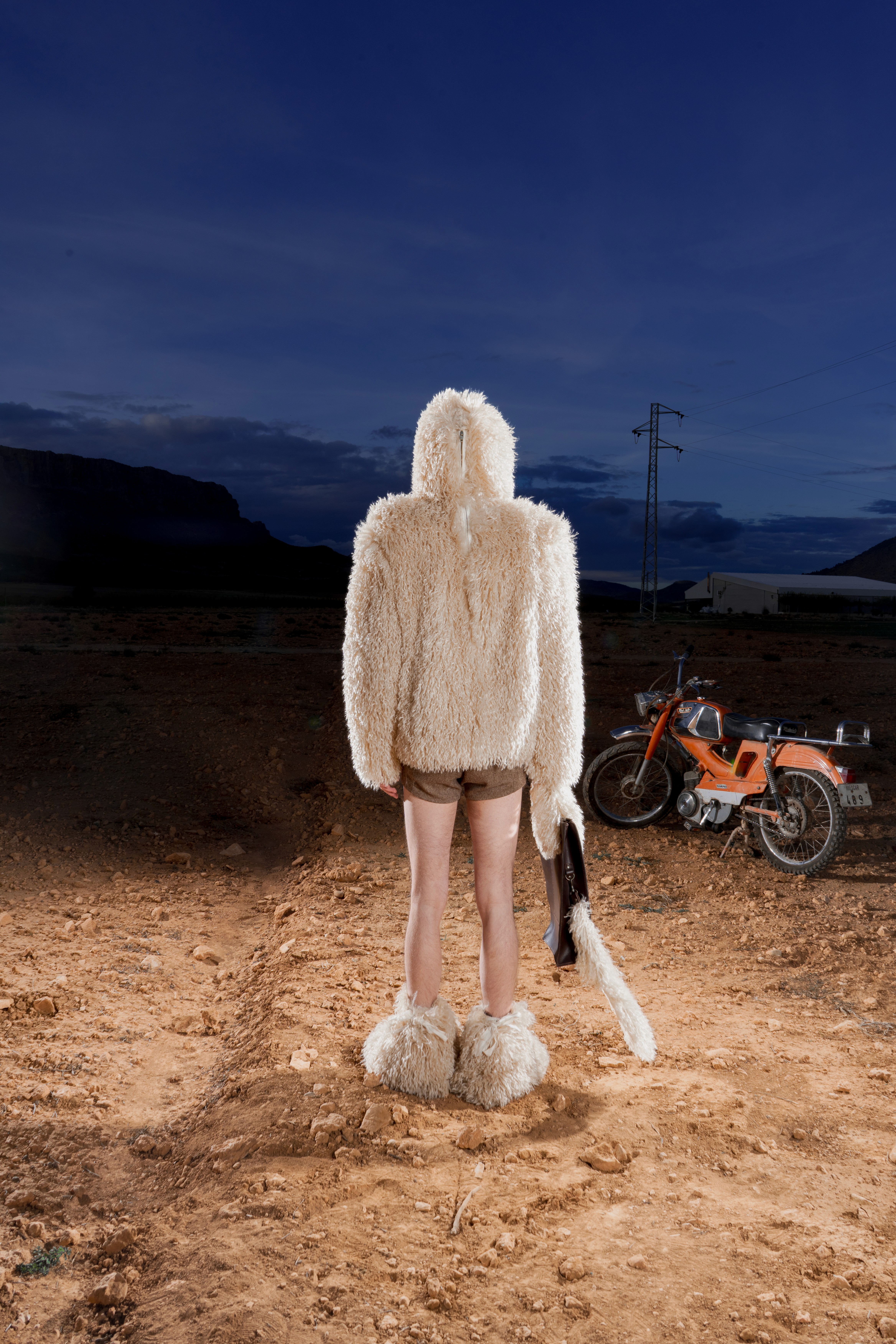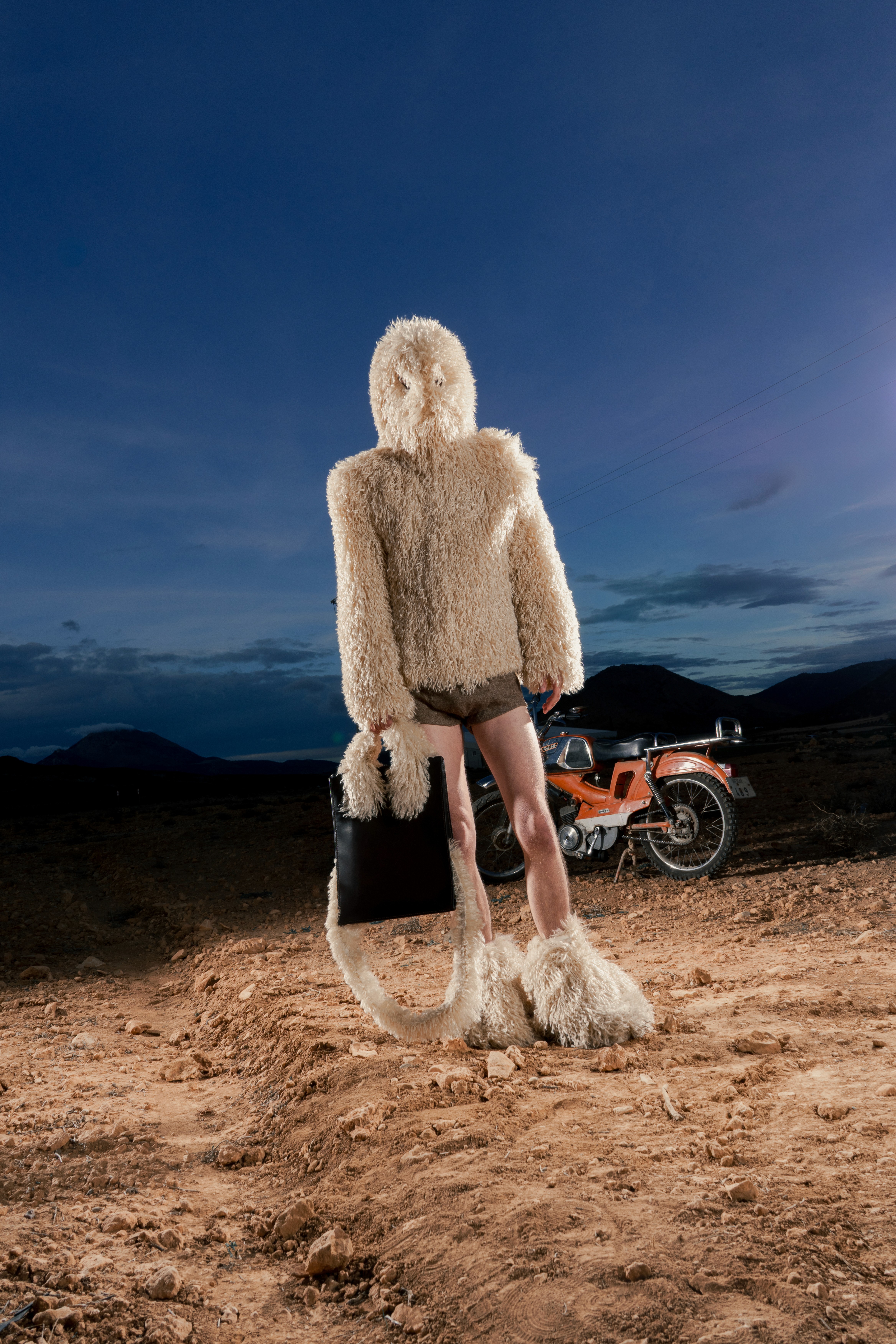 Abrigo de pelo de Mongolia sintético con cremallera completa, estructurado con hombreras y acabado con un ligero fruncido en el bajo. En la parte inferior, minishorts de lana. En los pies, peucos de pelo de Mongolia a tono. En las manos, el BoniBag Mongolia en piel de vacuno, recubierto de pelo en asas y correa.