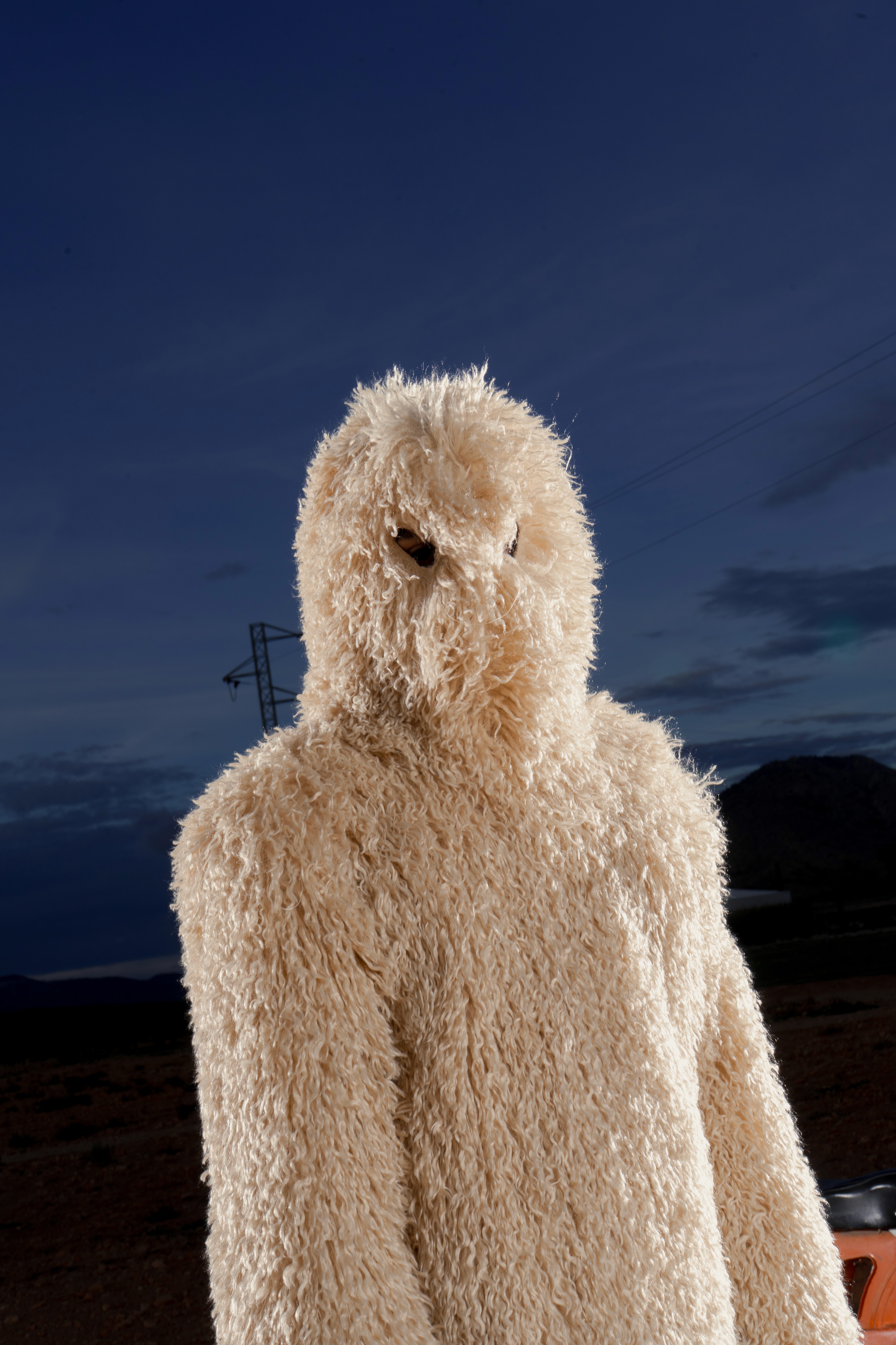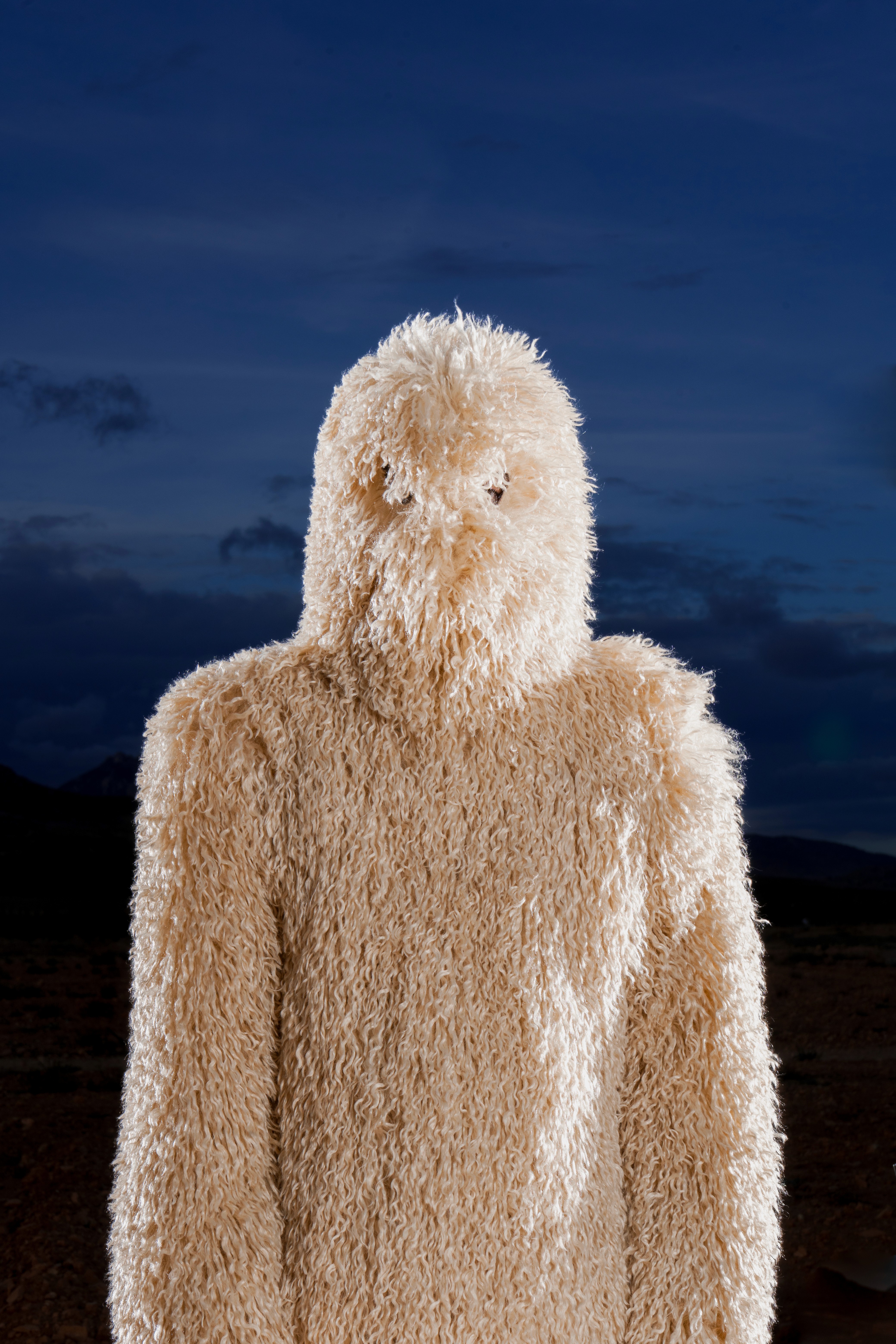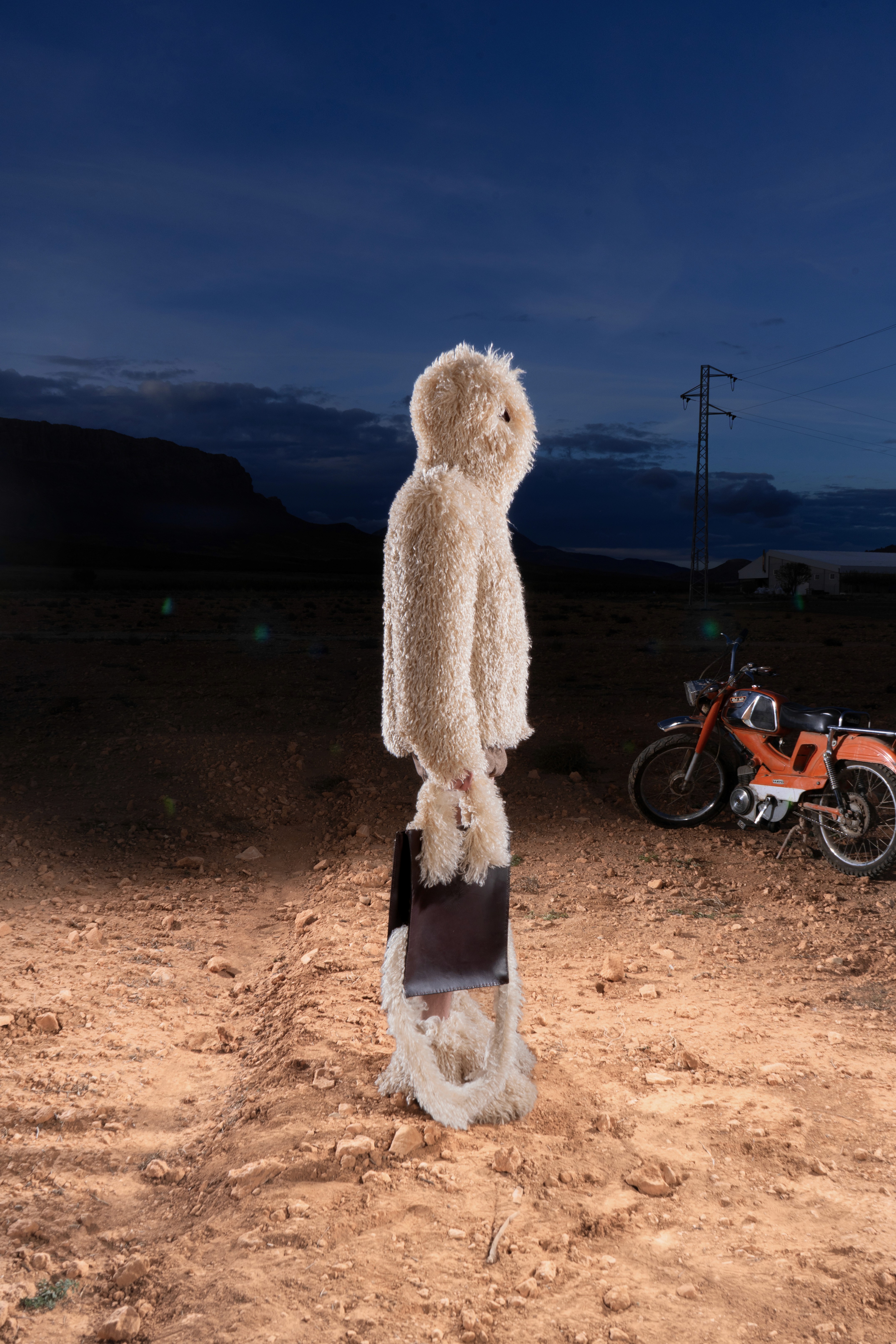 Abrigo de pelo de Mongolia sintético con cremallera completa, estructurado con hombreras y acabado con un ligero fruncido en el bajo. En la parte inferior, minishorts de lana. En los pies, peucos de pelo de Mongolia a tono. En las manos, el BoniBag Mongolia en piel de vacuno, recubierto de pelo en asas y correa.
