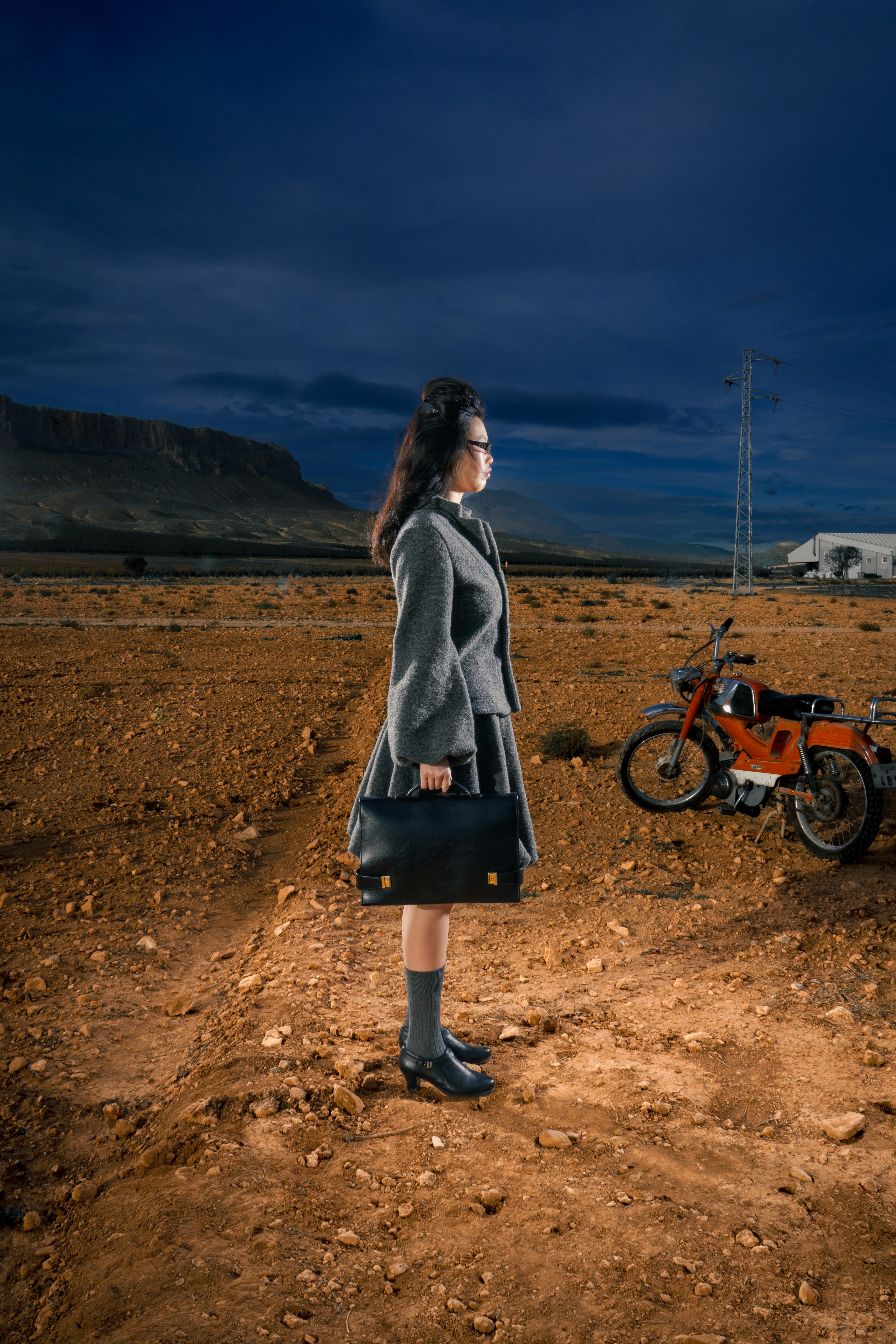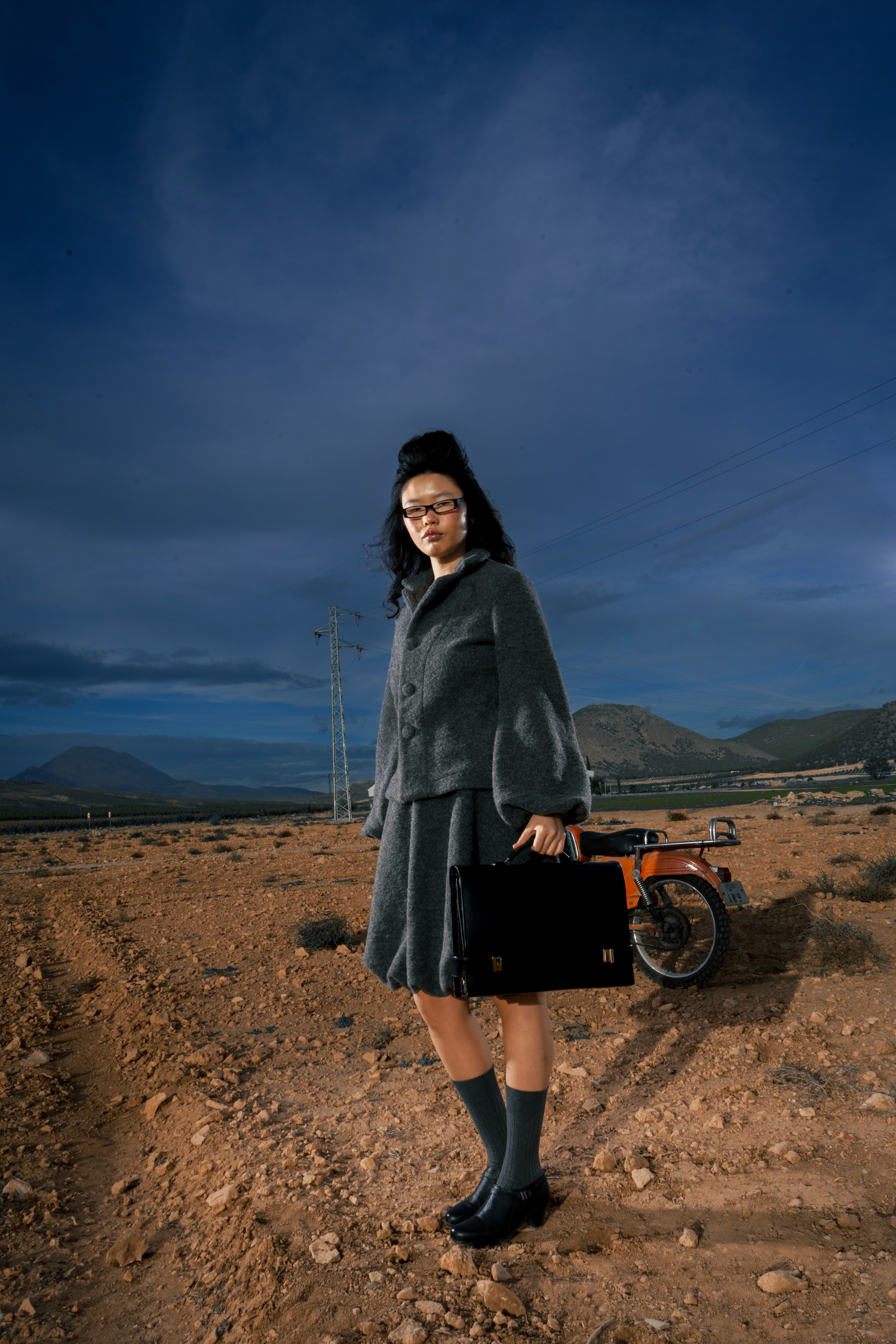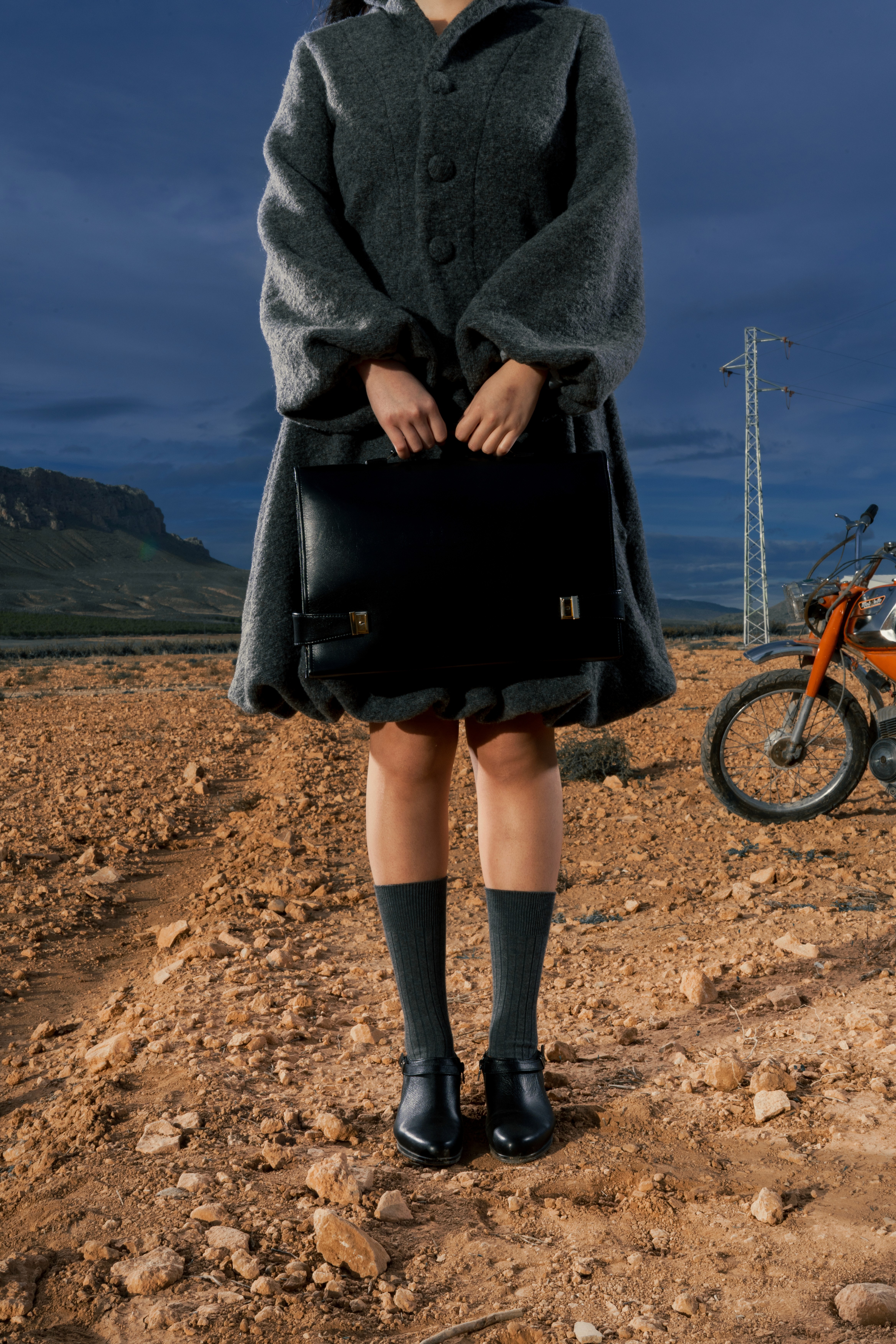 Americana confeccionada en punto de lana, ceñida en la cintura, con solapa mediolevantada, cierre de botones grandes forrados a juego y mangas globo. Falda globo a conjunto. Tacón cubano negro con calcetines a tono. En las manos, maletín de piel de vacuno negro.