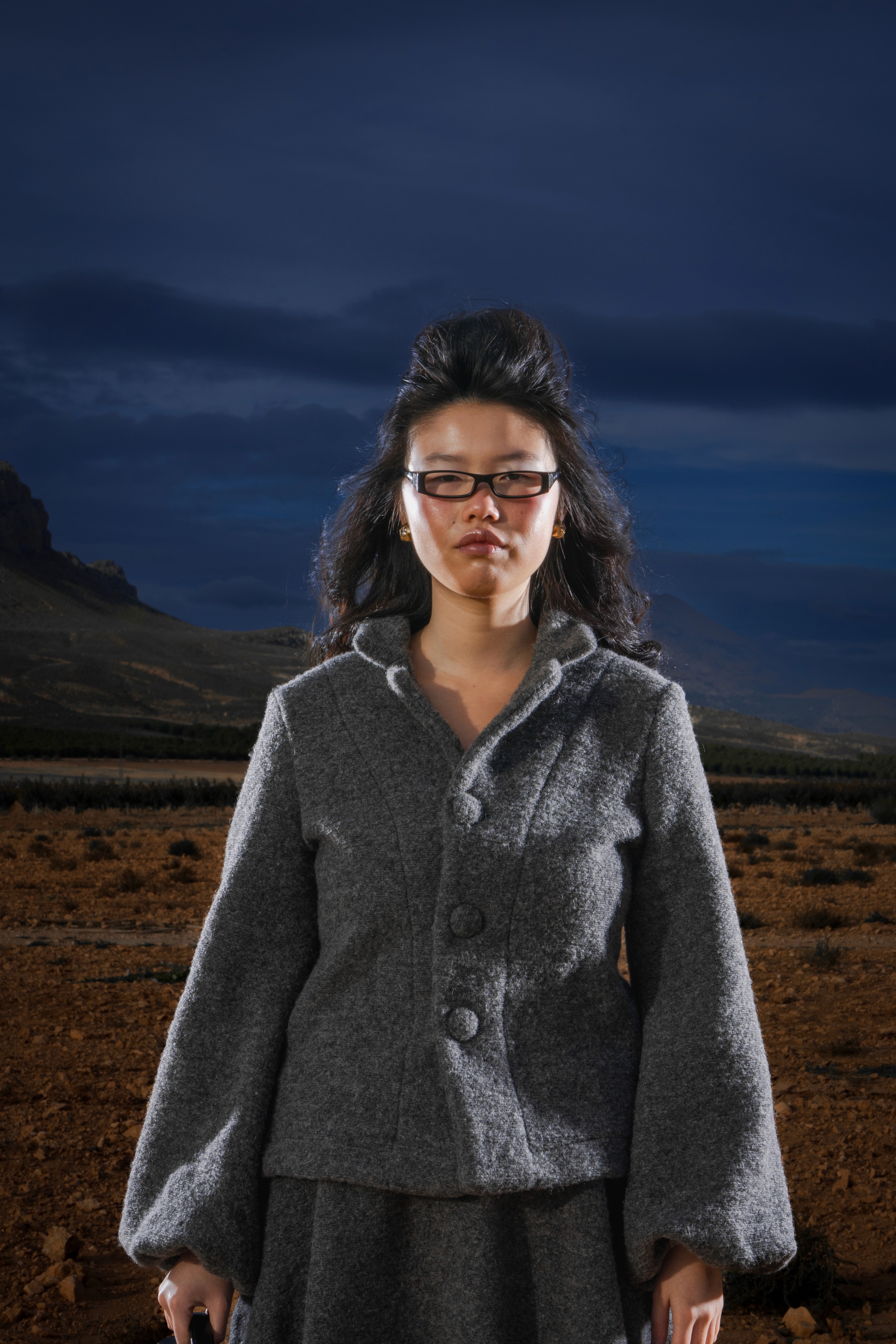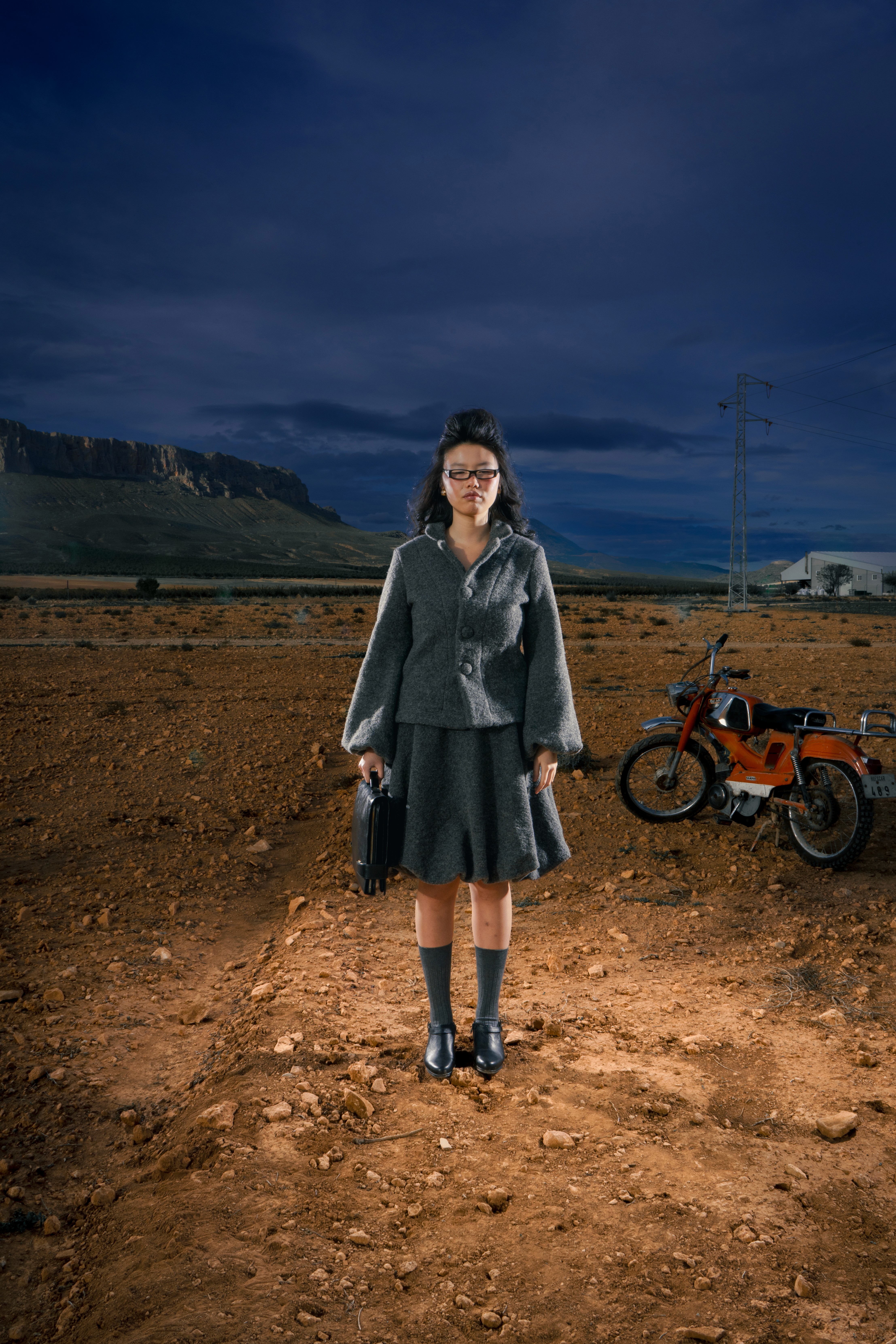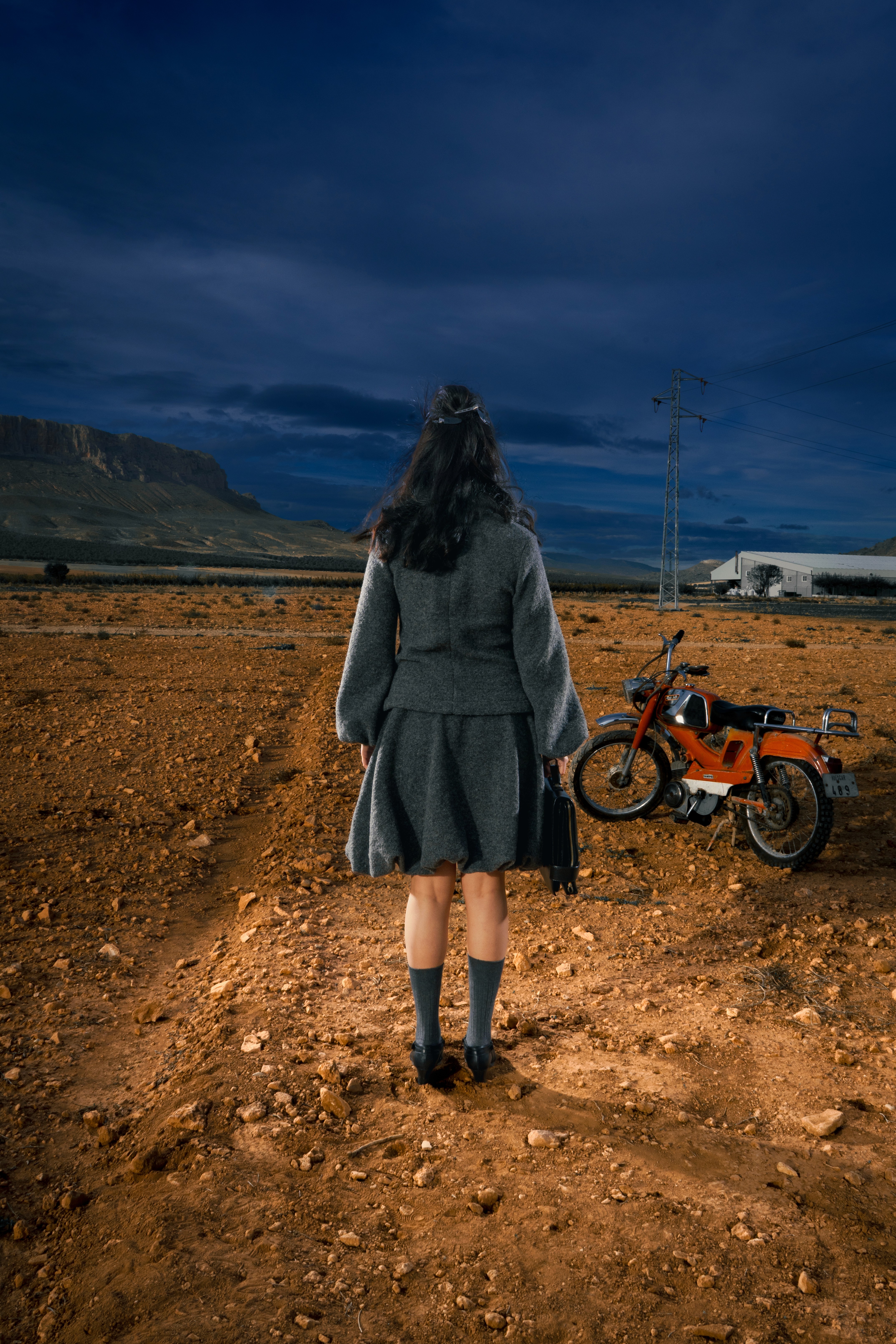 Americana confeccionada en punto de lana, ceñida en la cintura, con solapa mediolevantada, cierre de botones grandes forrados a juego y mangas globo. Falda globo a conjunto. Tacón cubano negro con calcetines a tono. En las manos, maletín de piel de vacuno negro.
