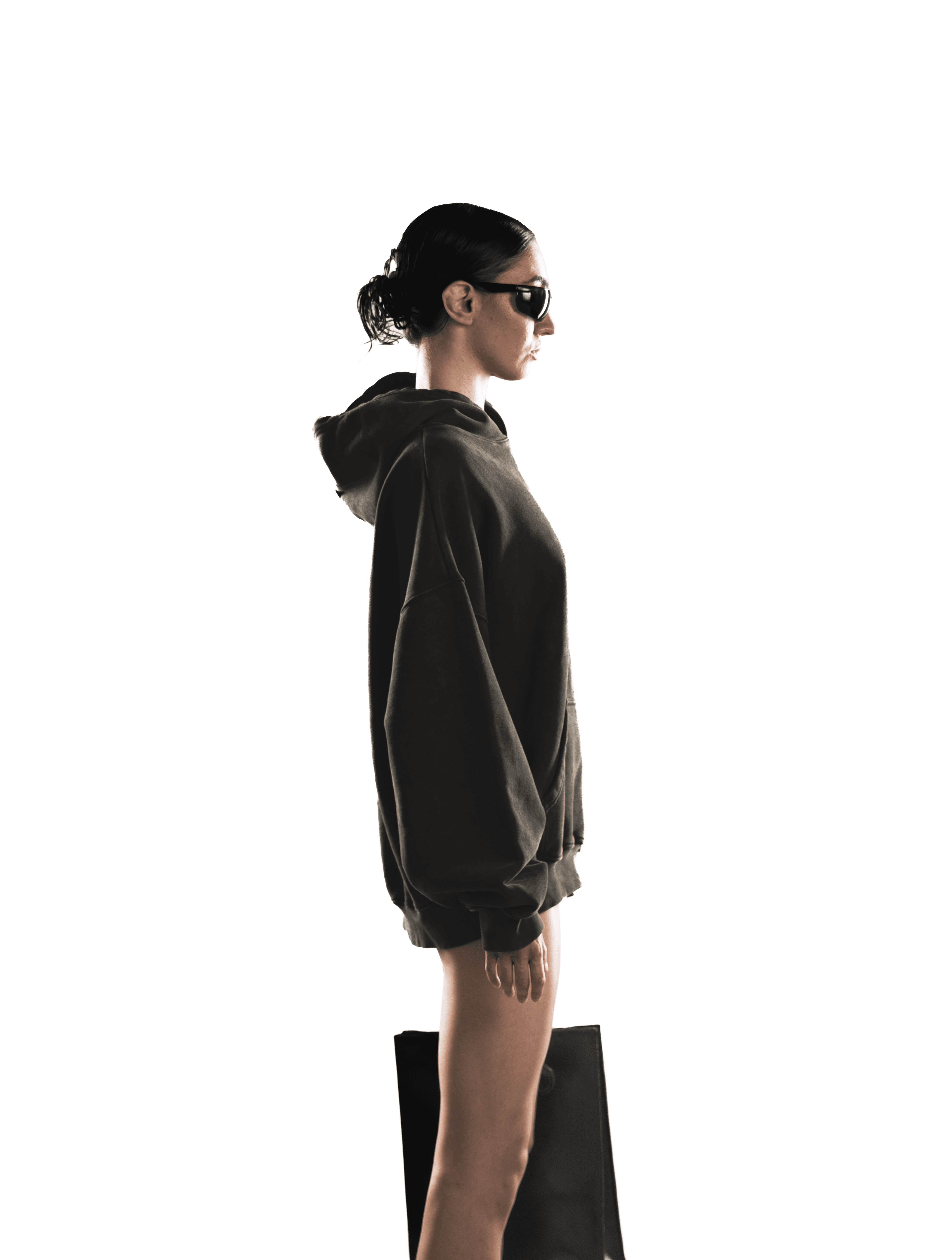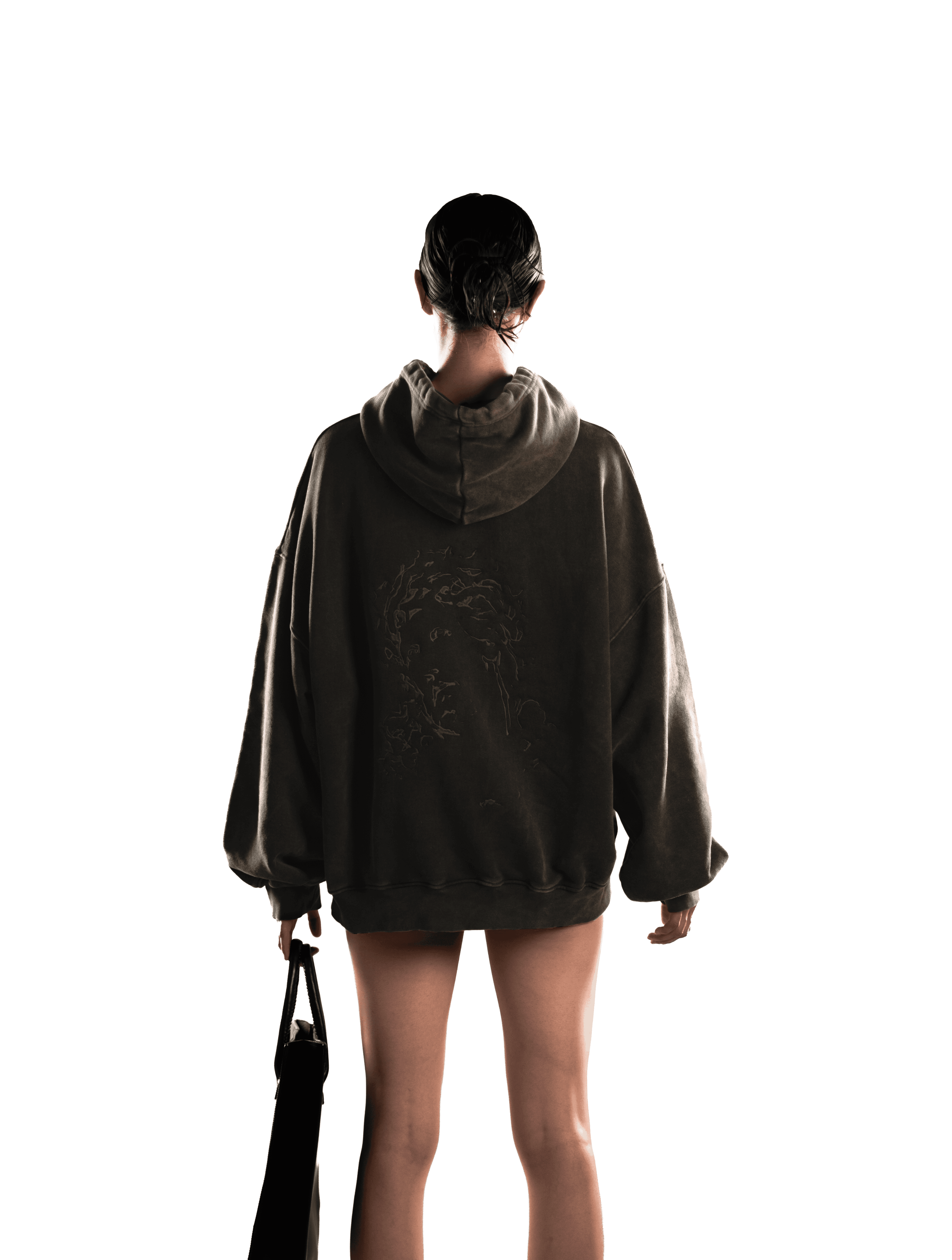 Su tejido de felpa francesa cepillada de punto denso con bucles uniformes e inclinados ofrece una textura densa y suave al tacto, mientras que el teñido en prenda aporta un acabado vintage con un sutil efecto desgastado.