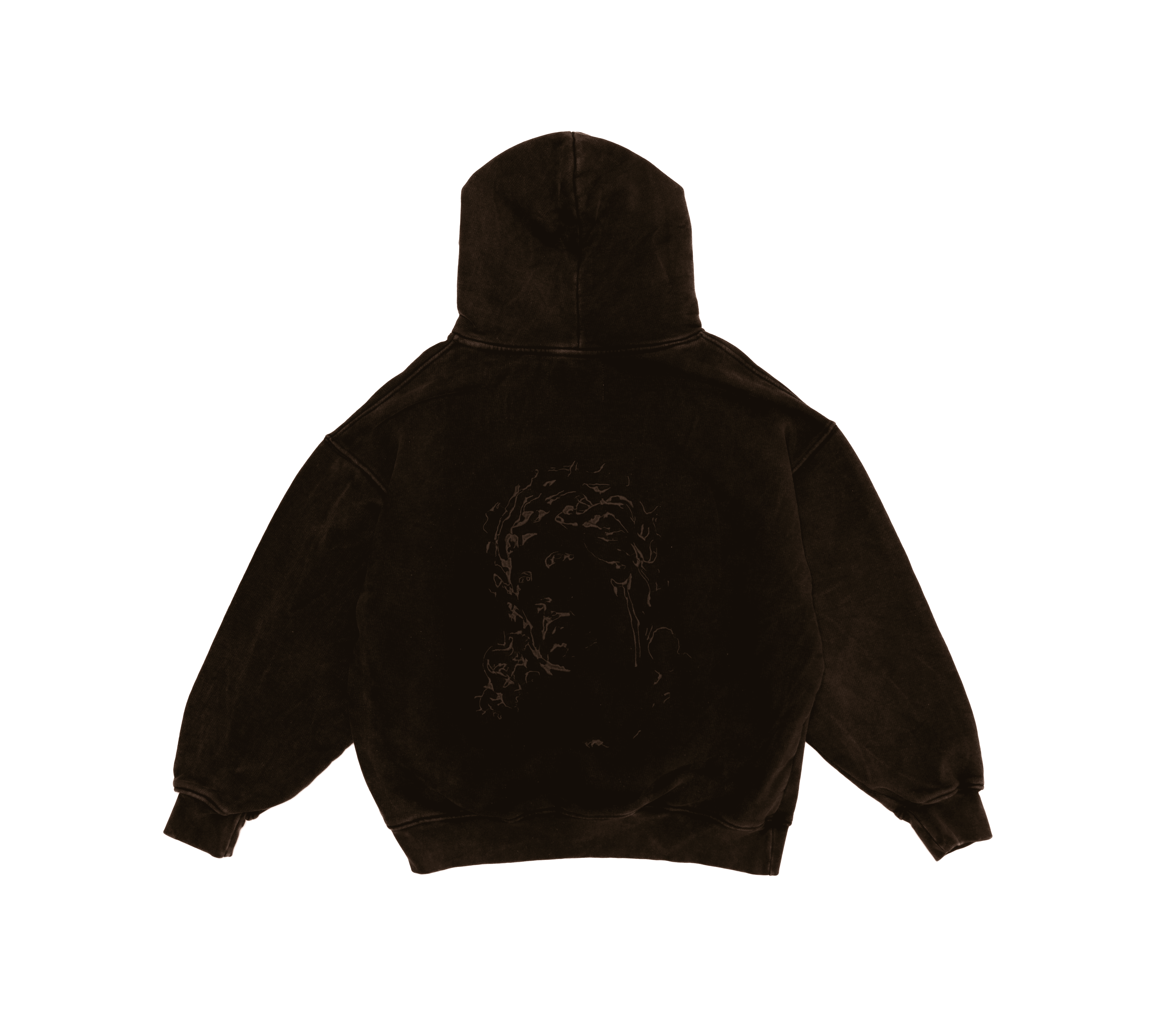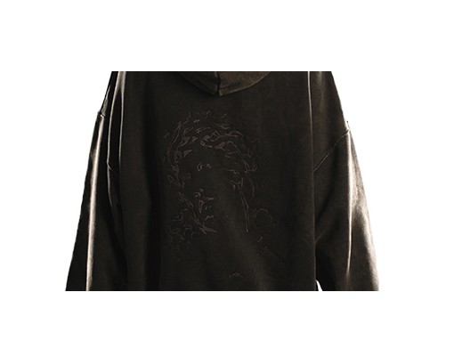 Esta pieza destaca por un bordado de gran tamaño del Cristo representativo de NouVelleMaison, que cubre toda la parte trasera de la prenda. Su tono, muy similar al del tejido, permite que se mimetice sutilmente, aportando un carácter único y distintivo.